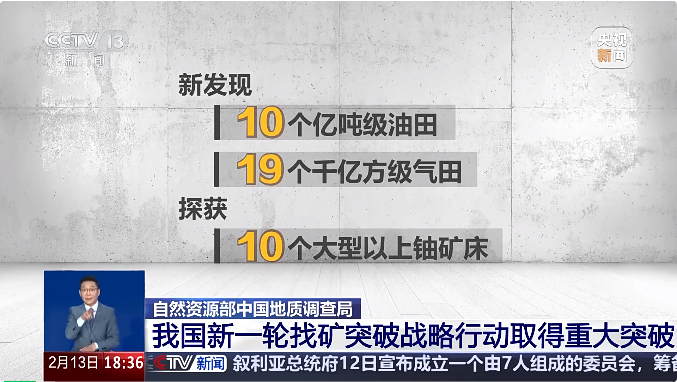 2011年至2020年,我國啟動了找礦突破行動。相關數據統計,這一輪突破行動,石油、天然氣新增資源量分別為101億噸、6.85萬億立方米,發現17個億噸級大油田和21個千億立方米級大氣田;新增煤炭資源量5268億噸、鎳資源量349萬噸,新形成32處非油氣礦產資源基地。