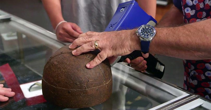 在這一期節(jié)目中,一位顧客帶來了一個被認為是鐵做的頭盔。一位專家證實,這是一個約有1500年歷史的真正的盎格魯-撒克遜頭盔。這頂頭盔完好無損,是一件非常罕見的古董。通常情況下,鐵會在有氧氣存在的環(huán)境中分解,因此這個頭盔很可能被遺留在如沼澤或河流等的缺氧環(huán)境中而得以完好保存。