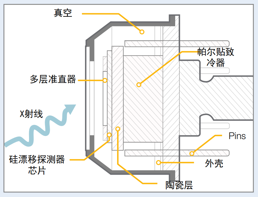 XRF探測器基本上是由硅晶圓(一種用于探測X射線的半導體材料)、制冷器和電子器件組成。