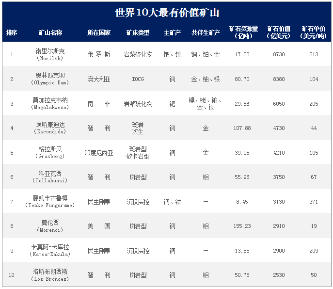 利用關(guān)聯(lián)公司礦業(yè)情報(MiningIntelligence)的數(shù)據(jù),按照現(xiàn)行價格,Mining.com網(wǎng)站計算了礦山資源總價值,并列出了世界10大在產(chǎn)賤金屬和貴金屬礦山。