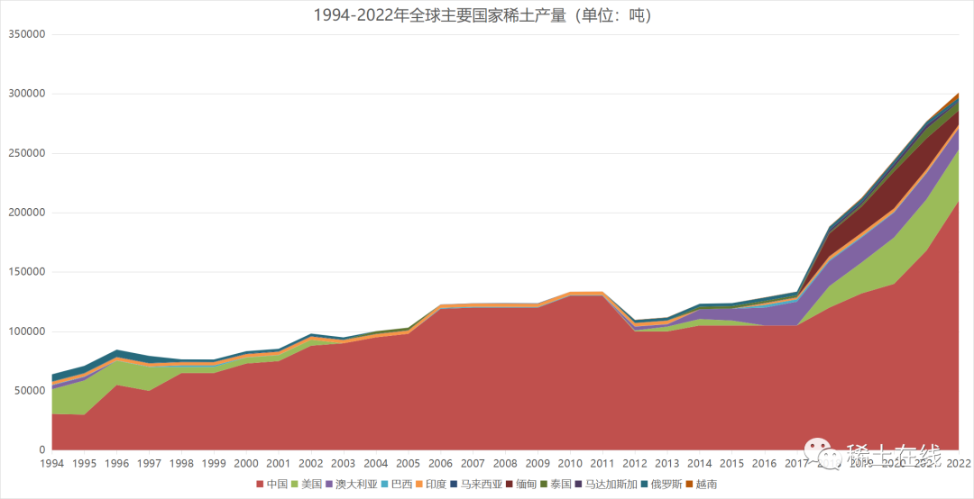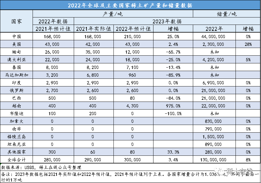 2022年全球稀土礦產(chǎn)量30萬噸,相比于2021年實際值增加1萬噸,增幅3.4%,小于2021年的16.7%,增速放緩,主要國家稀土礦產(chǎn)量見下表。