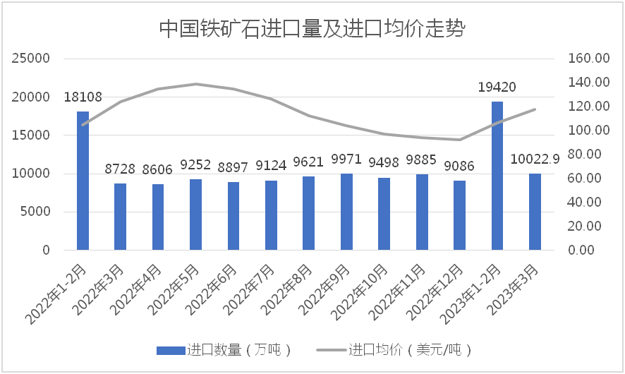 據(jù)海關(guān)總署數(shù)據(jù)顯示,2023年1-3月份,我國(guó)累計(jì)進(jìn)口鐵礦石29433.5萬噸,同比增長(zhǎng)9.8%,進(jìn)口均價(jià)110.6美元/噸,同比下降12.0%。但值得注意的是,今年3月份,我國(guó)進(jìn)口鐵礦石量?jī)r(jià)齊升,單月進(jìn)口鐵礦石達(dá)到10022.9萬噸,同比增長(zhǎng)14.8%,進(jìn)口均價(jià)為117.7美元/噸,較今年1-2月均價(jià)上漲11.43美元/噸,增長(zhǎng)10.76%。