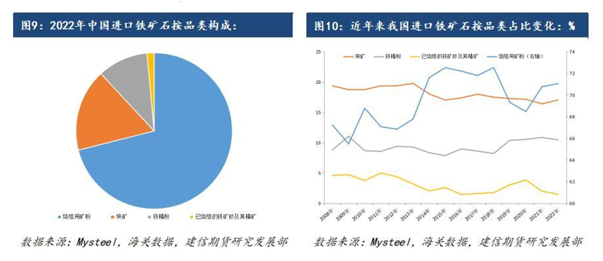 從進(jìn)口品類來(lái)看,我國(guó)燒結(jié)用粉礦占比最高,2022年占比約為71.0%;塊礦居次,占比約為17.0%;鐵精粉第三,占比約為10.5%;已燒結(jié)的鐵礦砂占比最小僅為1.5%。