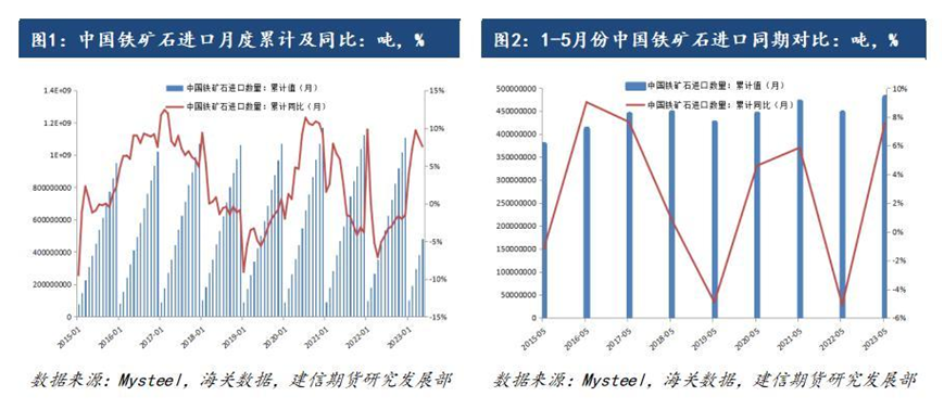 據(jù)我的鋼鐵網(wǎng)數(shù)據(jù)顯示,今年1-5月份中國(guó)鐵礦石進(jìn)口量達(dá)到4.8075億噸,同比增長(zhǎng)7.7%,從絕對(duì)值數(shù)量上來(lái)說(shuō),已經(jīng)超過(guò)2021年同期的最高值4.7093億噸,再創(chuàng)歷史同期新高。從今年1-5月份進(jìn)口數(shù)據(jù)來(lái)看,2023年我國(guó)鐵礦石進(jìn)口規(guī)模或再度走高,不排除將創(chuàng)下歷年鐵礦石進(jìn)口量新高的可能。
