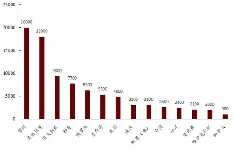 全球銅資源儲(chǔ)量分布較集中,據(jù)USGS數(shù)據(jù),2022年全球銅儲(chǔ)量8.9億噸,其中智利、澳大利亞、秘魯儲(chǔ)量規(guī)模居前,分別占比21%、11%、9%,CR3達(dá)到 41%。從供應(yīng)來看,智利、秘魯、剛果(金)為全球銅礦最重要的供給來源,2022年銅礦產(chǎn)量分別達(dá)520、220、220萬噸,占全球銅礦供給分別 24%、10%、10%。值得注意的是,智利正面臨礦山老化、品位下降的問題,年產(chǎn)量于2018年見頂于583 萬噸,隨后逐年下滑;秘魯2019年產(chǎn)銅246萬噸,隨后受疫情和當(dāng)?shù)卣值纫蛩財(cái)_動(dòng)有所減量,也在逐年下滑,2022年產(chǎn)量220萬噸;而非洲代表國(guó)家剛果(金)銅供給增量顯著,逐漸成長(zhǎng)為最重要的供給國(guó)之一,年產(chǎn)量從2012年的60萬噸增長(zhǎng)到2022年的220 萬噸,與老牌產(chǎn)銅國(guó)秘魯相當(dāng)。