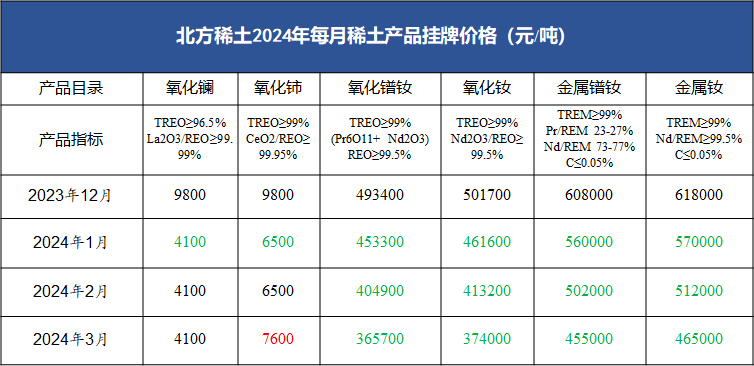 3月1日晚間,北方稀土發布2024年3月稀土產品掛牌價格,多個稀土產品價格環比均出現較大幅度下跌,僅氧化鈰價格環比出現上漲。