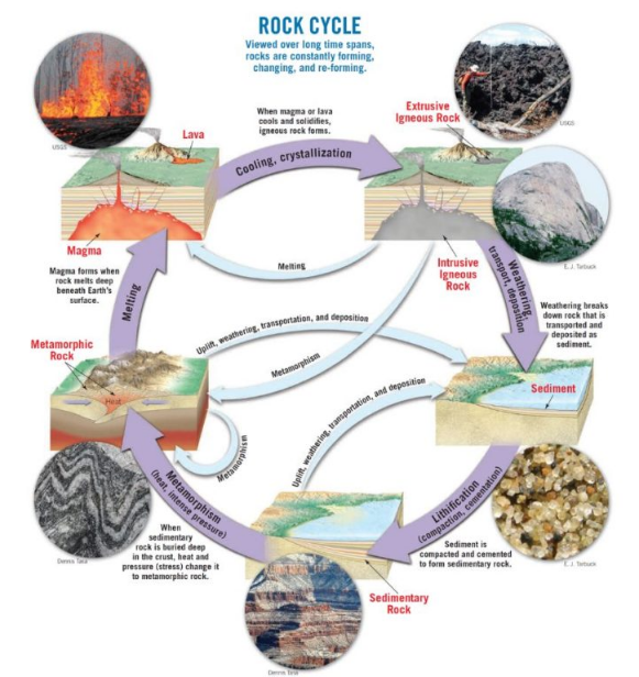巖石的誕生:巖石是由礦物或礦物質的天然聚合物組成。它們通過一系列地質過程形成,始于巖石循環。這個循環包括三種主要類型的巖石:火成巖、沉積巖和變質巖?;鸪蓭r源自于熔融巖漿,可以是在地表以下冷卻而成的(侵入巖)或在地表上凝固而成的(噴發巖)。沉積巖是由沉積物積累和壓實而形成的。而變質巖是指之前存在的巖石經歷了高溫高壓作用,發生了變質。