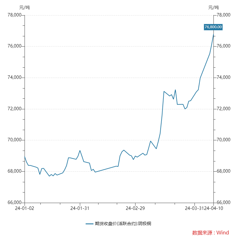 今年以來銅價持續震蕩上行。具體來看,國內方面,wind數據顯示,截至4月10日下午收盤,滬銅主連報76800元/噸,較上個交易日上漲0.66%,1月至今,銅價持續攀升,較年初上漲7840元/噸,漲幅達11.4%。國際方面,截至2024年4月8日收盤,LME銅報9443美元/噸,國內國外分別創下近兩年和近一年的價格新高。
