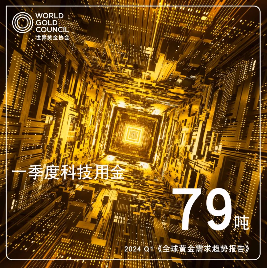 此外,在電子行業人工智能熱潮的推動下,全球科技用金需求同比回升10%至79噸,其中,一季度電子行業用金需求同比大漲13%,達64噸。