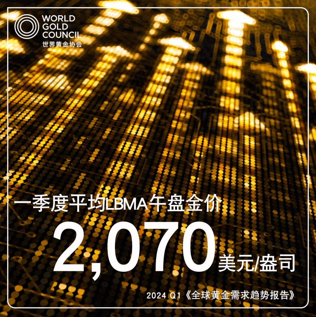 來自場外交易市場穩健的投資需求、全球央行的持續購金及亞洲買家日益高漲的需求,共同推動一季度黃金均價創下歷史新高,達到2070美元/盎司,同比增長10%,環比增長5%。具體來看,盡管金價屢創新高,但全球金飾需求總體仍保持韌性,同比僅下降2%至479噸,但仍然高于過去5年一季度需求的平均水平(465噸)3%。亞洲地區金飾需求的上漲抵消了歐洲和北美地區需求的下降。