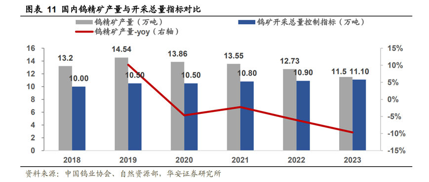 今年3月,自然資源部下達了2024年度首批僅為6.2萬噸的鎢礦開采總量控制指標,規模的收縮意味著國內鎢精礦產量將延續下滑趨勢。隨著中國對鎢資源采取總量控制、出口配額管理、國家收儲等逐步收緊行業政策的實施,預計未來全球鎢礦供應將逐步趨緊,鎢的產量增速將逐步放緩。