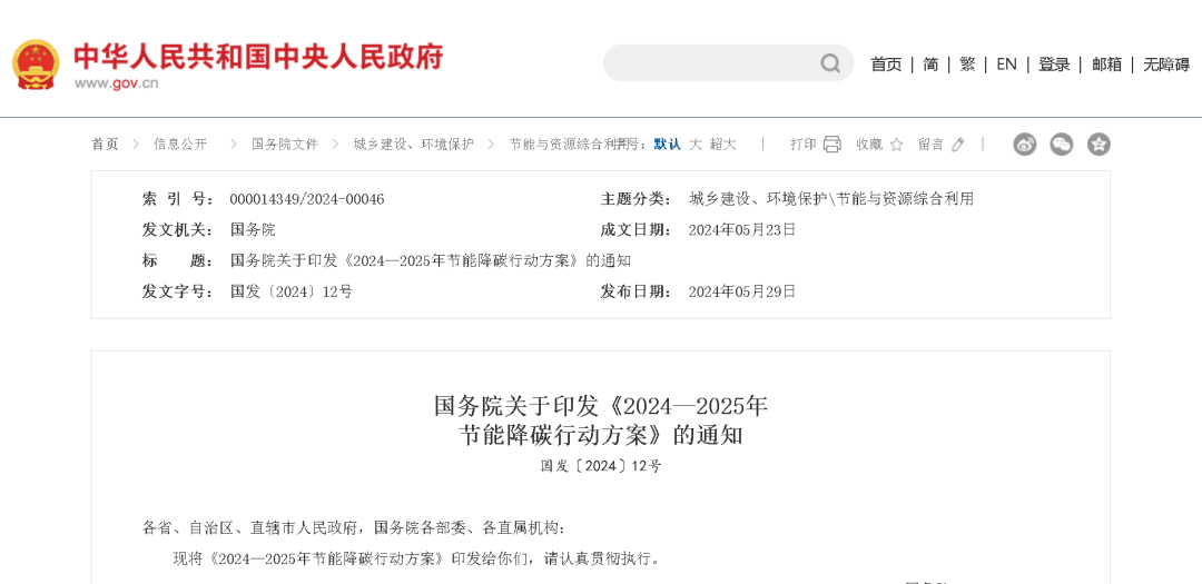 為貫徹落實黨中央、國務院決策部署,錨定“十四五”節能降碳目標任務,加大節能降碳攻堅力度,分領域分行業實施節能降碳專項行動,更好發揮節能降碳的經濟效益、社會效益和生態效益,為實現碳達峰碳中和目標奠定基礎,國家發展改革委會同有關方面研究起草了《2024—2025年節能降碳行動方案》,經國務院常務會議審議通過后,近日由國務院印發。