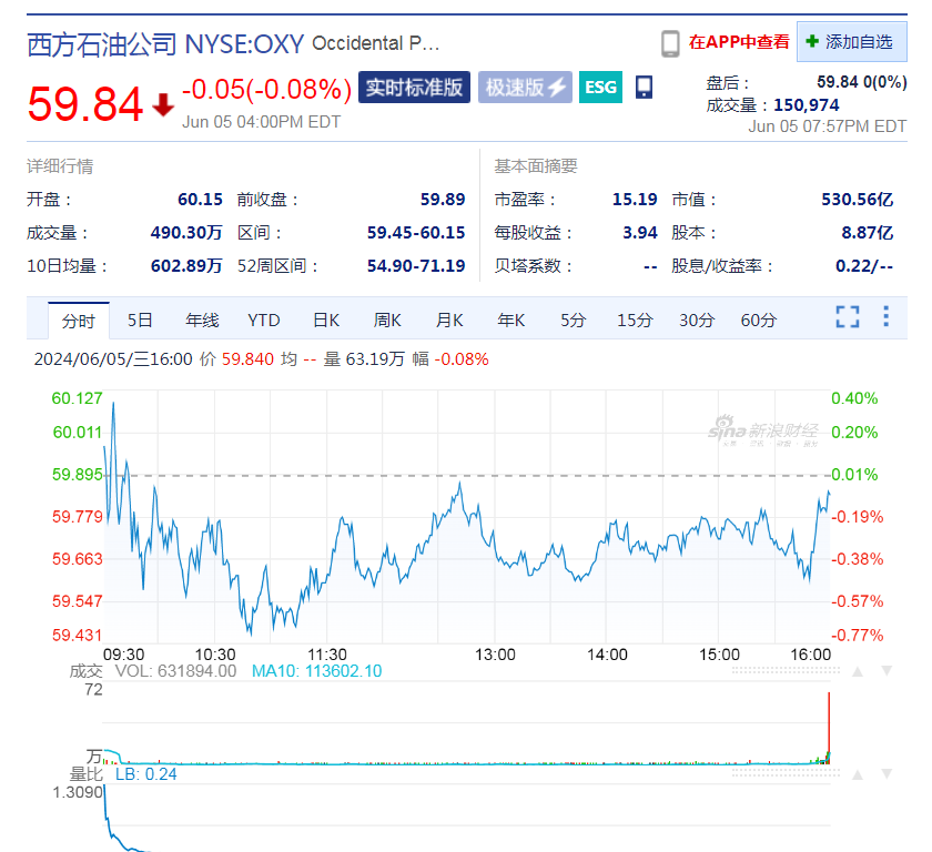 西方石油公司收報59.84美元,跌幅0.08%,市值530.56億美元。