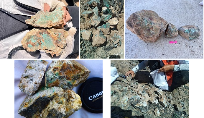 其中1處銅(金)多金屬礦帶走向近東西向,初步控制礦帶長約400米,寬約20米,帶內(nèi)見大量孔雀石、石英褐鐵礦化及原生黃銅礦,快速分析儀顯示新鮮面銅普遍大于5%(孔雀石化處銅大于70%),同時有金、鉛、鋅顯示。另一處銅金多金屬礦帶走向280度,斷續(xù)長近600米,寬10-20米不等,帶內(nèi)發(fā)現(xiàn)多處硅化銅鉛礦體,主要為孔雀石、黃銅礦及方鉛礦,目估銅品位大于5%。另外幾處銅礦點經(jīng)地表取樣也發(fā)現(xiàn)塊狀富銅礦體,目估化學樣品位銅大于5%。