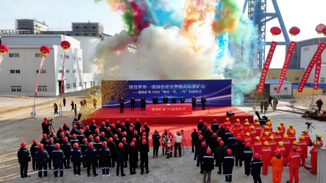 2024年12月30日上午9時36分,瑞海礦業(yè)有限公司副井井塔前嘉賓齊聚、彩球飄飄、旌旗獵獵,十二條巨幅標語迎風(fēng)招展,兩臺TBM(全斷面硬巖隧道掘進機)啟動儀式揭幕,瑞海礦業(yè)總經(jīng)理于明海、浙江省隧道工程集團公司副董事長黃德祥、山東招金礦業(yè)股份有限公司董事長姜桂鵬先后作了發(fā)言和致辭。上午10時,隨著萊州市政府副市長邱召明宣布“萊州市瑞海礦業(yè)有限公司‘海岳一號、海岳二號’TBM發(fā)車”,萊州市政府副市長邱召明,招遠市政府副市長荊興業(yè),山東招金集團有限公司副董事長、總經(jīng)理王樂譯,招金礦業(yè)董事長姜桂鵬等嘉賓共同按下啟動球。