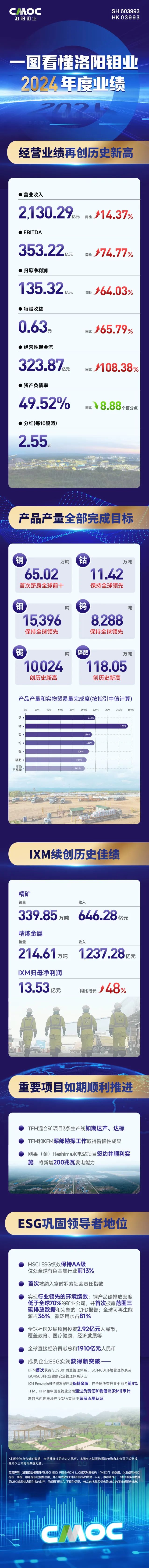3月21日,洛陽鉬業(yè)發(fā)布的業(yè)績(jī)報(bào)告顯示,公司2024年?duì)I業(yè)收入首次邁入兩千億元門檻,為2130.29億元,同比增長(zhǎng)14.37%;歸母凈利潤(rùn)首破百億元,為135.32億元,同比增長(zhǎng)64.03%;扣非后歸母凈利潤(rùn)131.19億元,同比增長(zhǎng)110.48%;每股收益0.63元,同比增長(zhǎng)65.79%。