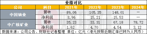 從業(yè)績方面來看,中國鈾業(yè)實力較中廣核礦業(yè)更強,2021-2023年中國鈾業(yè)營收分別為89.06億元、105.35億元、148.01億元,凈利潤分別為8.96億元、15.21億元、15.53億元;2021-2024年中廣核礦業(yè)營收分別為38.60億港元、36.49億港元、73.60億港元、86.24億港元,凈利潤分別為1.78億港元、5.15億港元、4.97億港元、3.42億港元。