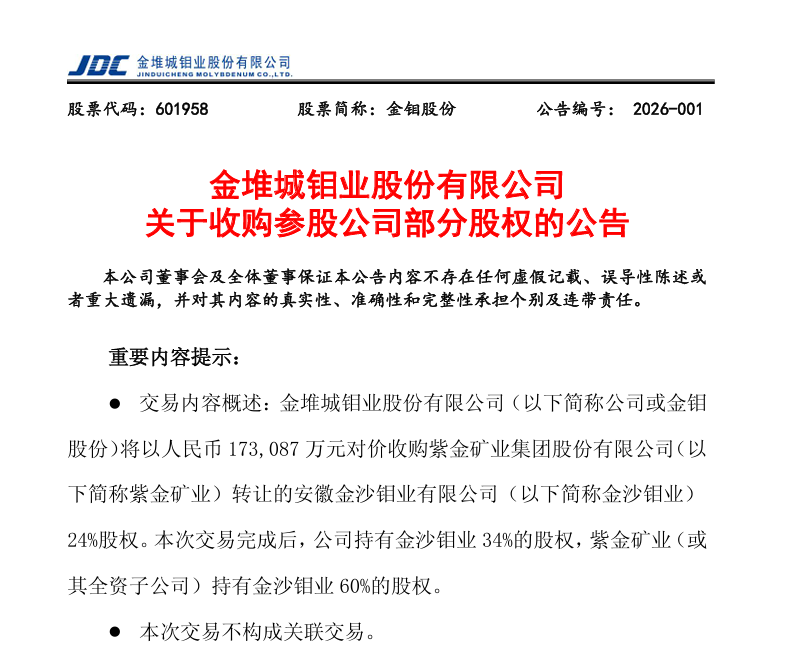 2026年1月,安徽金寨沙坪溝鉬礦迎來兩大關鍵節點:本月19日,紫金礦業以17.3億元轉讓項目24%股權給金鉬股份,達成強強聯合開發共識。