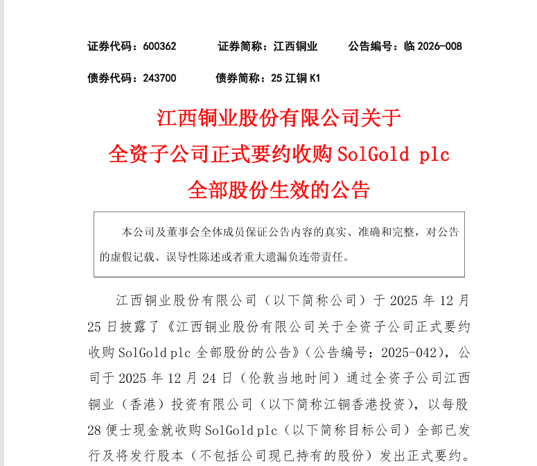 這場備受行業關注的跨境并購,始于2025年12月,前后歷時3個月,期間波折不斷。江銅最初通過全資子公司江西銅業(香港)投資有限公司發起收購要約,先后兩次以每股26便士的價格報價,均被SolGold董事會拒絕,收購進程一度陷入停滯。